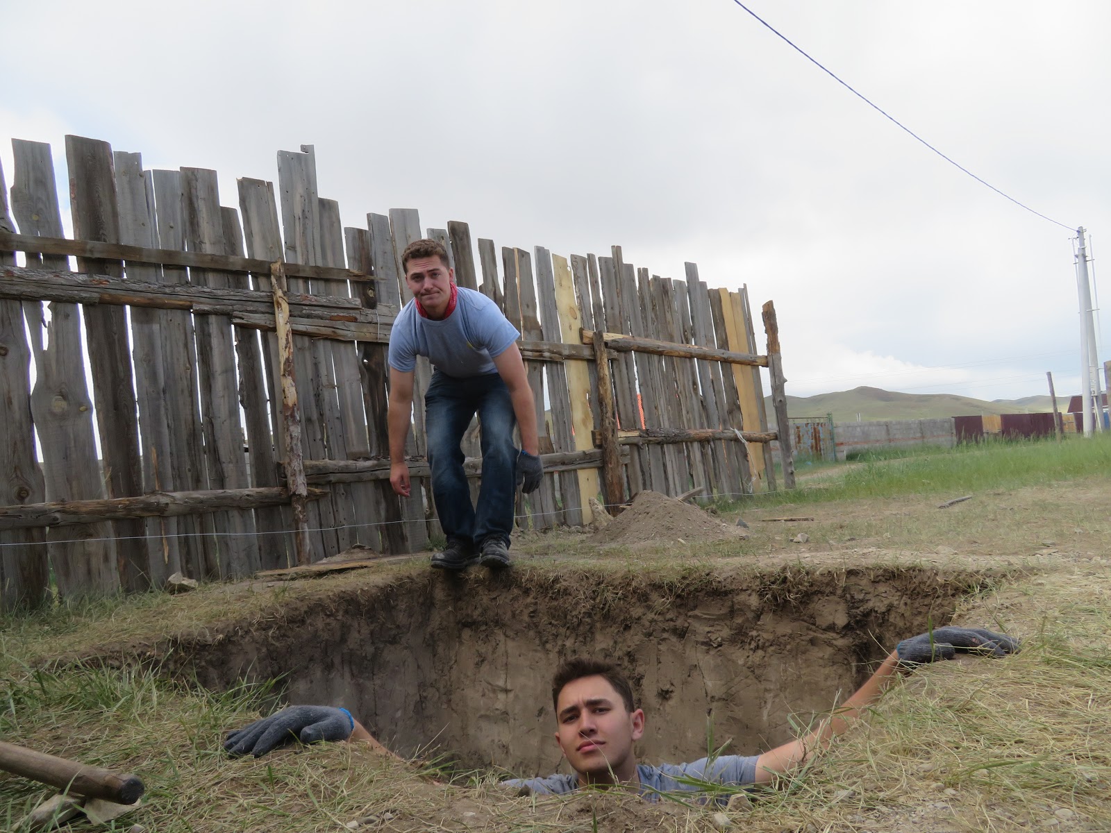 I went on a split with some elders out on the edge of the city this week. They pretty much serve in the countryside though. It's like a whole different place over there. They said they needed some help with service on Saturday, so Sorenson and I went there Saturday morning and met them and another set of elders. The guy who we were going to be helping picked us up in his Prius (6 of us and it's a 4 person car, it was pretty interesting). We drove literally 30 minutes more into the countryside and picked some stuff up from his old house and then drove an hour more to his new home. It's basically the countryside. We get to his lot and there is nothing there except a ger pad and a hole in the ground they will use for a bathroom later on. We roll up to the hole and take our stuff out from his car and he just says "dig here." So we got the shovels and pick axes and started, then he just left. All we had were some buckets, rope, and a piece of wood used to level out the dirt we put on the ger pad. So we were alone out in this countryside place for a while. The hole was about 5 feet deep already and we dug for a long time until it was 7 feet and over all of our heads by a long ways. This was like 4 hours in already so we decided to take a little break and walk around for a few minutes. We walked up to the top of the closest mountain/hill and took some pictures then came back. We called him when we got back and told him how deep it was and then he told us it needed to be at least 3 meters deep (which was pretty crazy because we are essentially just breaking up big rocks and shoveling those out). A little bit later his wife came, and she was super grateful for our help, and we packed up and left. But now we have us a weekly project. This guy wants us to come back every week and help him get his lot fixed up. It should be pretty fun. The whole thing was so third world though. We would shovel the rocks and dirt into the buckets and pull it up with a rope, dump it on the ger pad and then level it out with a piece of fence post. It was still really fun to help out though, we all had a really good time.