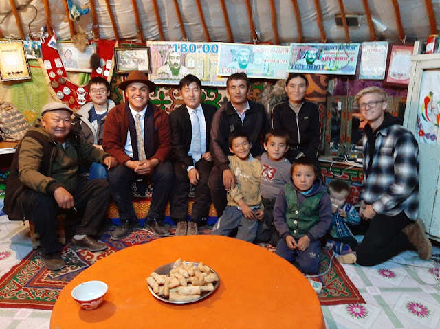 Okay so the the biggest part of the week was going to Khovd, it was one of the coolest places I've ever been. We flew out last P day and during the flight there weren't any clouds, so I could see everything and it's pretty wild how untouched this place is. I didn't see a single town below us as we went to Khovd. There is a single set of Elders out there and we went to check in on them and give them support. We got there, and the town of Khovd is super small, tucked behind a mountain, in this desert area in the middle of no where. There really is nothing around at all, it's the town and that's it. It felt very secluded from the world. We landed and got picked up by Morales and a ward member, his name is Ganhuyag, he's hilarious. He is the branch president out there. He was once in a major Mongolian gang. His conversion story is crazy. He has a big personality and he has a different accent than most people (people in Khovd all speak differently, it's like how in the south they have a different accent). We went straight to a hair cutting ceremony that a family invited Morales to, but we had to buy some gifts to give to the kid first, so we each bought a candy bar. We go into their ger and it was extremely traditional on the inside. They had the alter at the back, and the men's side and the women's side. It was very very cool to be in there. These 2 huge dudes dressed in deels were there and I tried talking to them but they didn't really have too much to say, so we sat there and ate their food they gave us. They had the whole traditional spread on the table in front of us, and gave us some blueberry juice to drink. After eating and chatting, they brought the boy and one old guy cut a piece of his hair, and then gave him the gift. The boy was only 3 years old, that is when they cut the hair. Then Ganhuyag cut his hair and gave the gift, and then they asked me to do it. So I did, and they were all surprised I knew the ins and outs of the traditions, and how to do it. After I cut the hair, they gave me a little thing of vodka, so I dipped my right ring finger in and flicked it in the air after it had alcohol on it. It's just what they do when they don't want to drink, but want to show respect. When I did this, the 2 old guys and Ganhuyag were dumbfounded that I knew to do that. The old guys said "you are more mongolian than any mongolian missionary who has been here before. You know our culture." And after that they had me sit at their table and we chatted for a long time together, they were super kind and nice guys. They asked me a lot about America and what I think about Mongolia, and how I got to speak so well (I actually still am not that good, they were just super nice people). It was very fun chatting with them and living the traditional mongolian life.